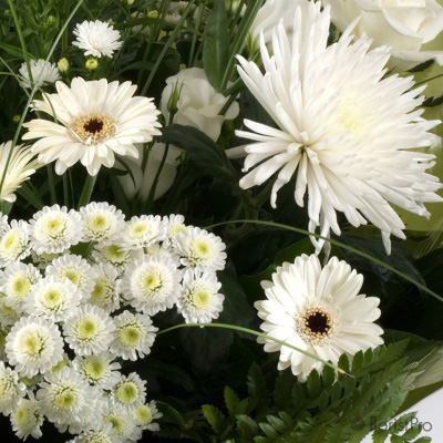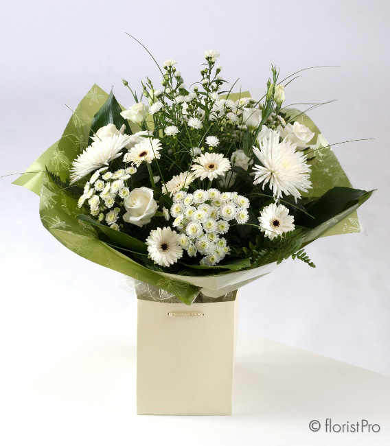 This handtied bouquet consists of seasonal white and green flowers and foliage, gift wrapped and presented in a stylish bag.